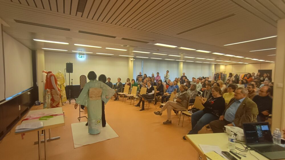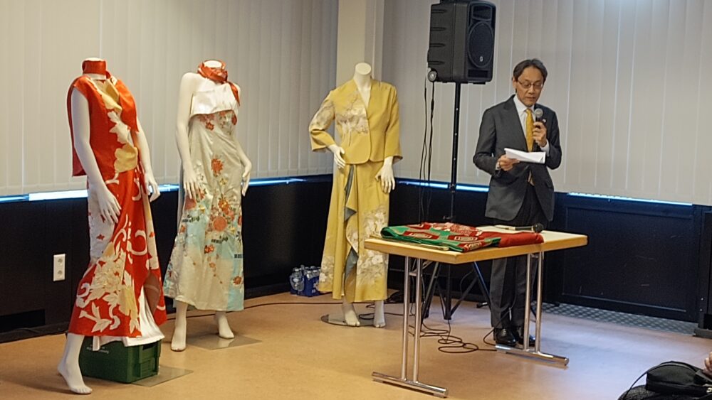 当イベントでも多くの着物がタンスに埋まって着用されていないことが説明されましたが、たまたま昨年里帰り時に、京都で着物のリメイクをビジネスとして行っている店をテレビで紹介していて、まさかルクセンブルクで実際にリメイクされた着物ドレスが見られるとは思いませんでした。