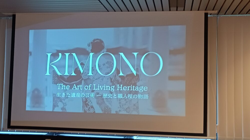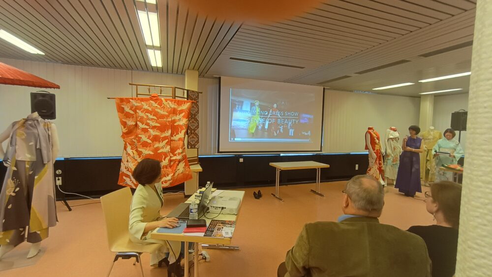 日本から来られたSense of Beautyの2人の女性による着物の歴史、製作過程のスライド、ビデオ説明に続いて、着物の着付け実演があり、最後にSense of Beautyさんが行っている着物のリメイクによるドレスが紹介されました。