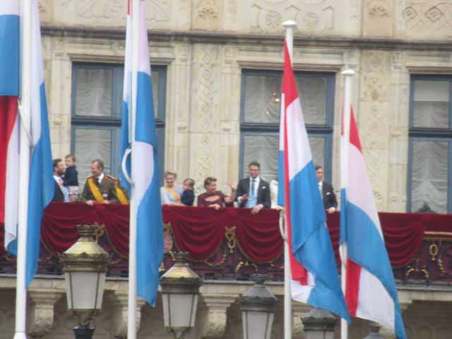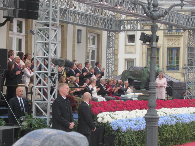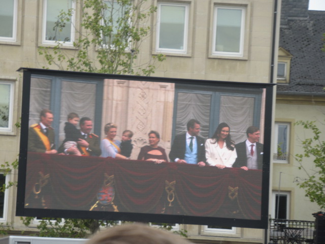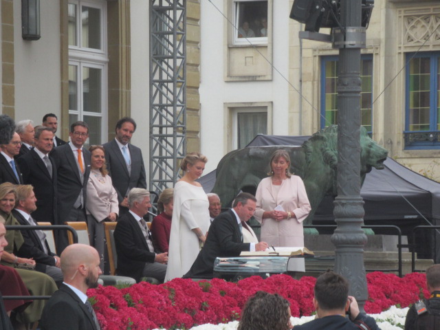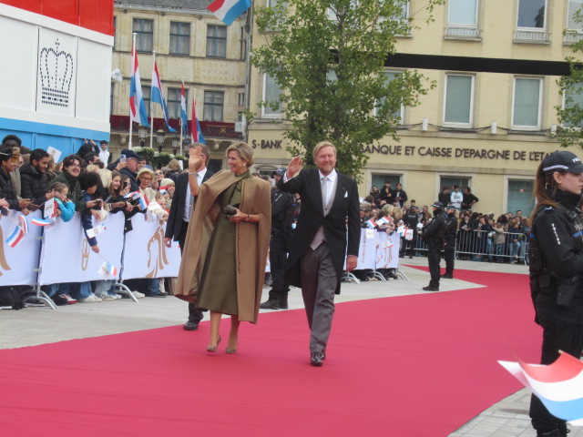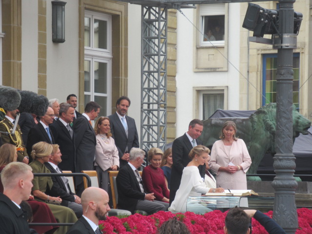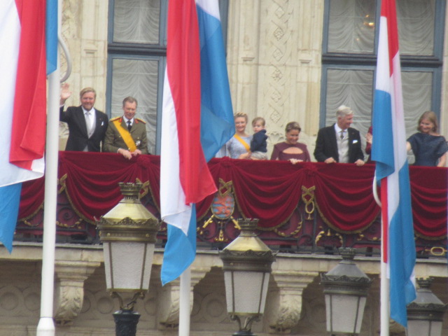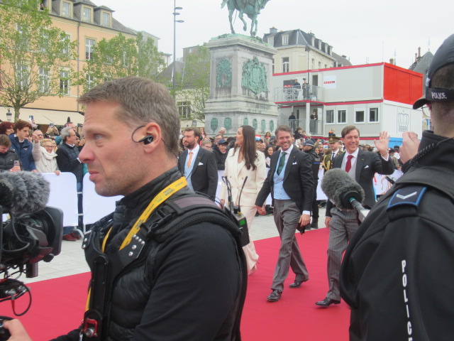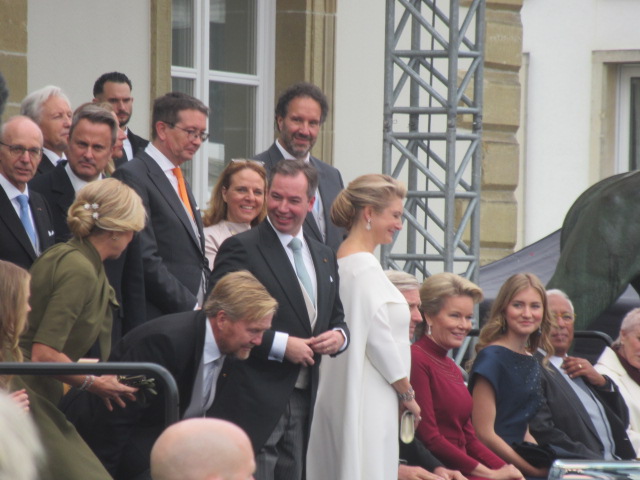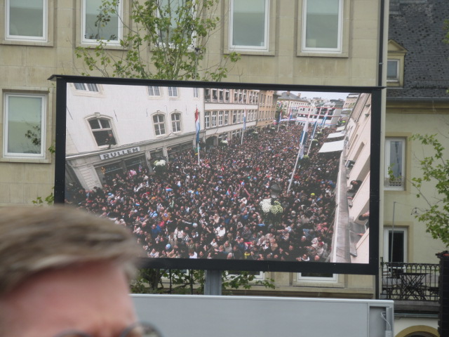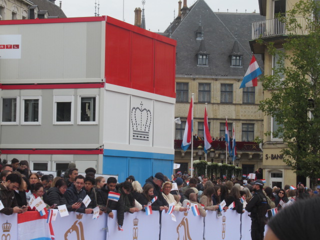 アンリ大公の退位式が大公宮殿で行われ、続いて、議会に移動してギヨーム大公の誕生儀式が行われました。ここまでは、建物内で行われるため、ネットでのライブ配信を視聴してから、バスで、宮殿に向かい、バルコニーでの記念撮影を試みましたが、11度の曇り空という肌寒い中でも多くの観客で、宮殿バルコニー前には近づけず、比較的空いていたギヨーム広場からの撮影を試みました。望遠で撮影しましたが、旗に遮られてよく見えませんでしたが、代わりに大スクリーンでの映像を見ることができました。しかも、その後、徒歩で市庁舎前で移動する際には、招待客のベルギー国王夫妻、オランダ国王夫妻は、目の前を通過され、最後に新大公夫妻が観客の声援に迎えらながらゆっくり移動されました。