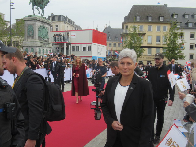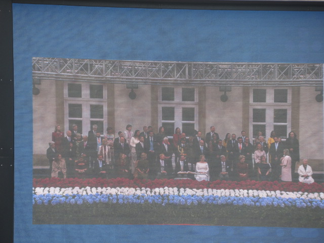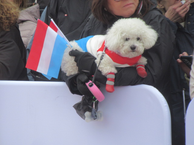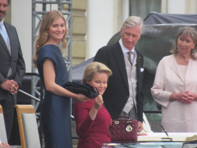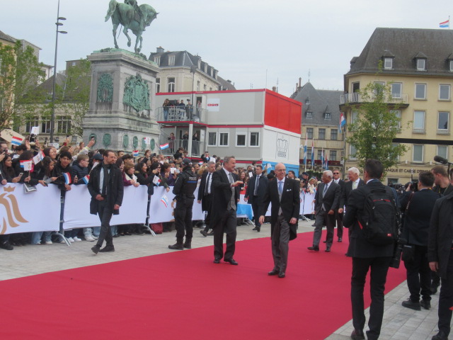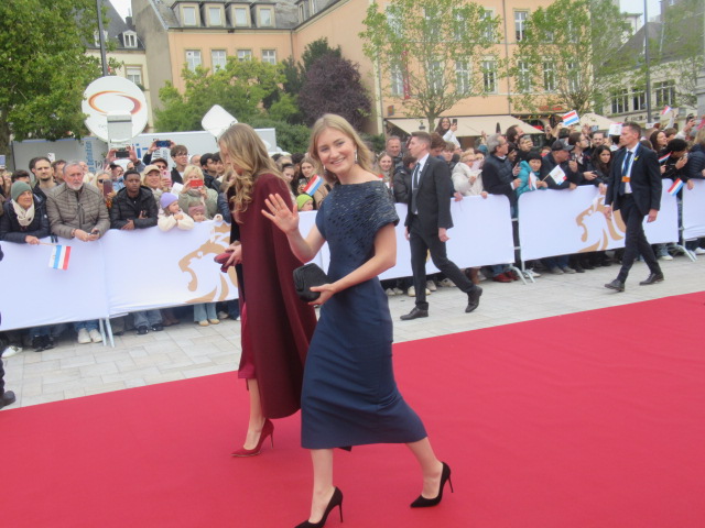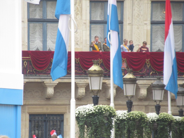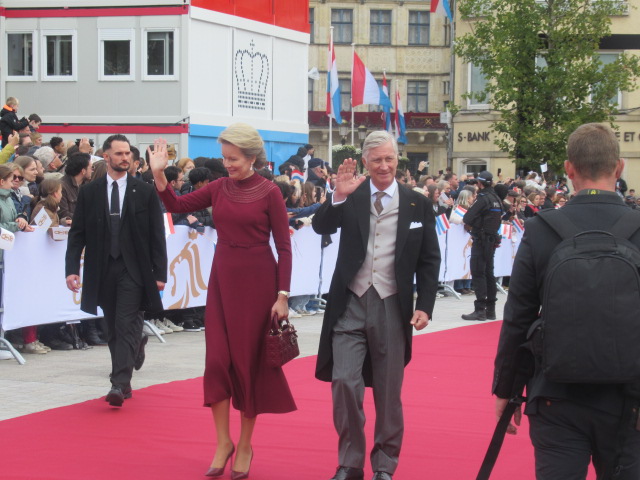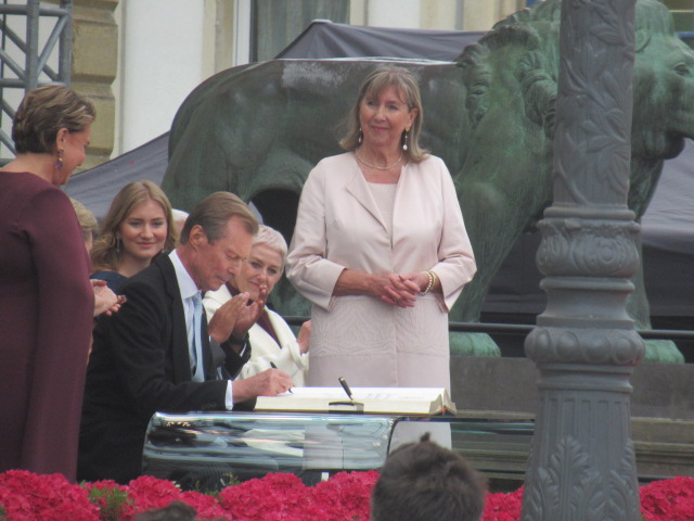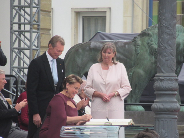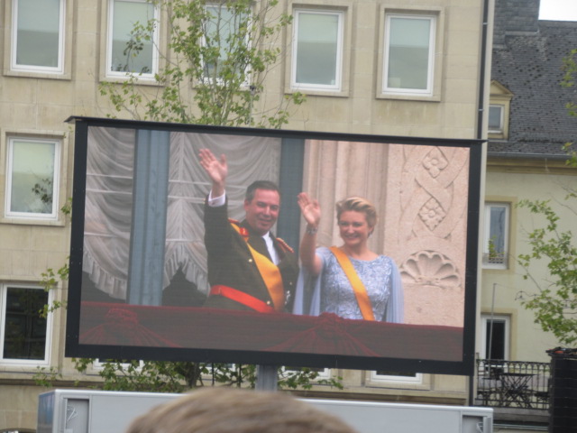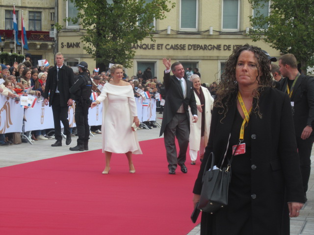 アンリ大公の退位式が大公宮殿で行われ、続いて、議会に移動してギヨーム大公の誕生儀式が行われました。ここまでは、建物内で行われるため、ネットでのライブ配信を視聴してから、バスで、宮殿に向かい、バルコニーでの記念撮影を試みましたが、11度の曇り空という肌寒い中でも多くの観客で、宮殿バルコニー前には近づけず、比較的空いていたギヨーム広場からの撮影を試みました。望遠で撮影しましたが、旗に遮られてよく見えませんでしたが、代わりに大スクリーンでの映像を見ることができました。しかも、その後、徒歩で市庁舎前で移動する際には、招待客のベルギー国王夫妻、オランダ国王夫妻は、目の前を通過され、最後に新大公夫妻が観客の声援に迎えらながらゆっくり移動されました。