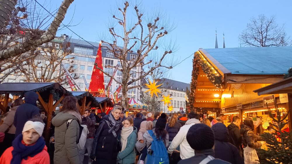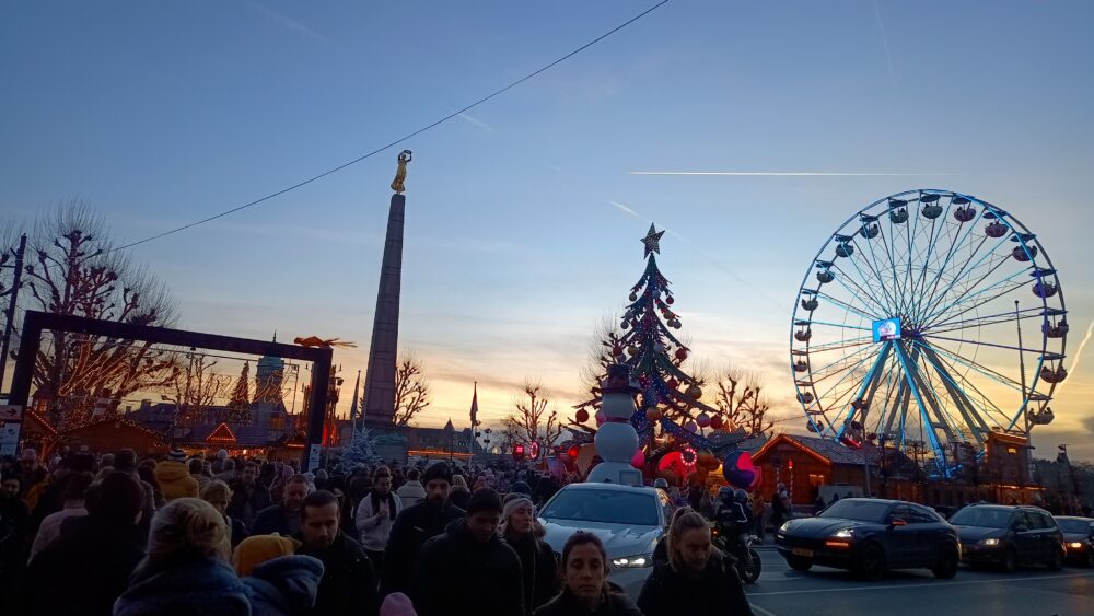 クリスマス前最後の日曜日の上に、天気もよかったため、中心街は買物客で、クリスマス市は観光客で混雑していました。特に、憲法広場会場内は、歩くのも大変なほどの混雑でした。