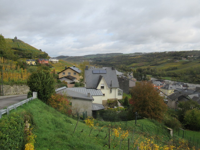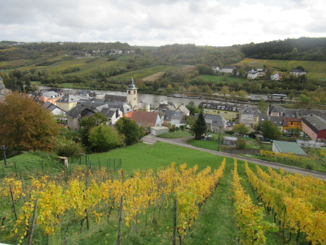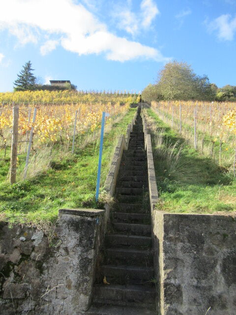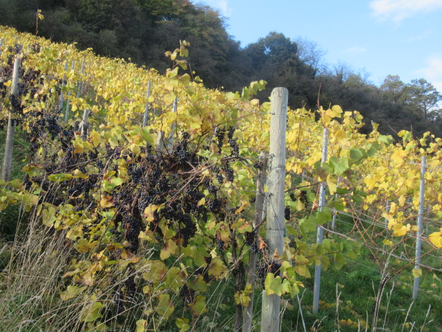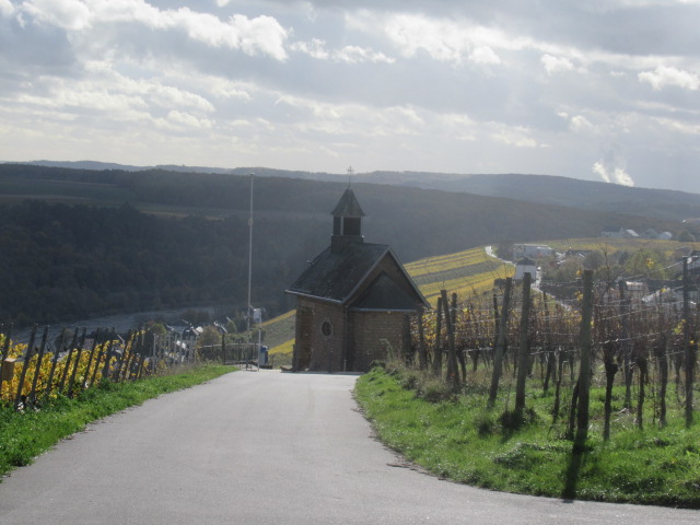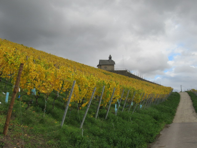 24日金曜日は、まだ前日の嵐の余韻で風が強く一時雨が降るあいにくの天気でしたが、私が主催する歩こう会の重要メンバーであった1人が3年間の駐在を終え帰国することになり、お別れ昼食会を兼ねた散策をモーゼル地方で開催しました。丁度、ぶどうの木の葉が黄色く染まって、遠くから見ると黄色の絨毯の中を歩いているみたいでした。初めに高台のレストランで昼食後、坂を下って、再び別の坂を上り丘の上のチャペルまで行って、隣の村までブドウ畑の中を散策しながら降りてきました。村の中には、直販もしてるフルーツジュース工場があり、丁度、リンゴを絞ってリンゴジュースを製造していました。幸い風は強かったですが、小雨程度だけ、青空や虹も楽しめました。