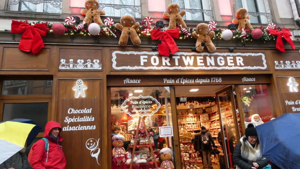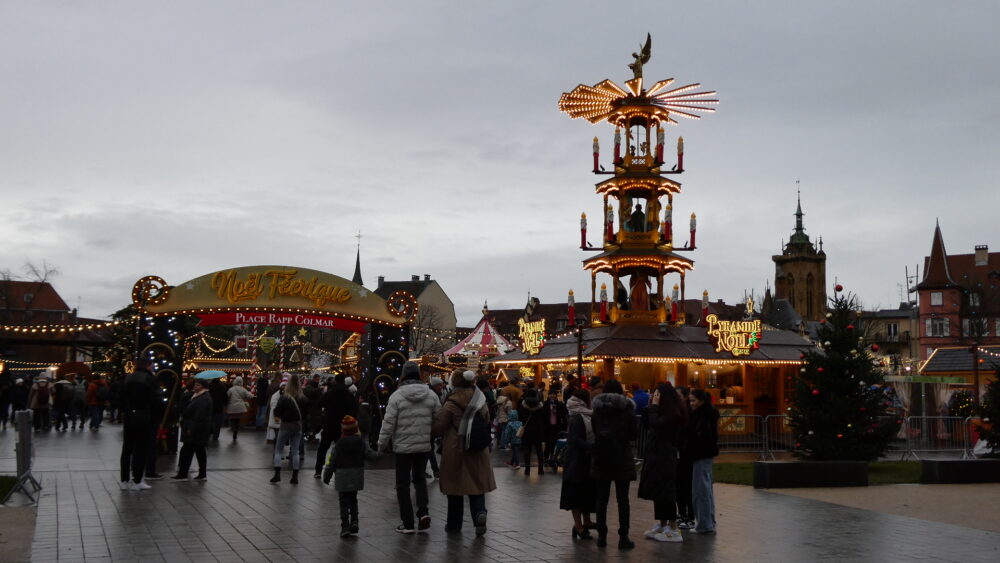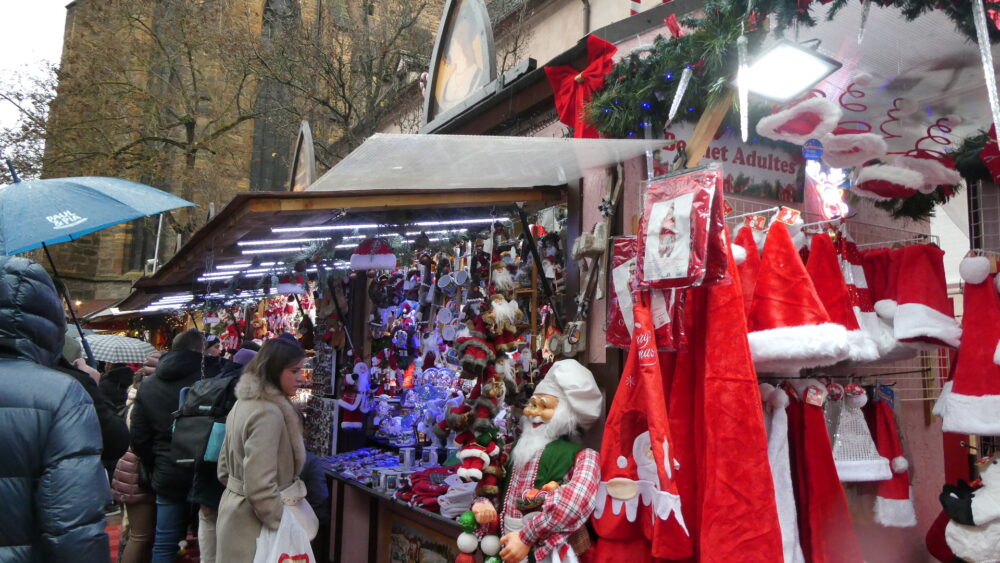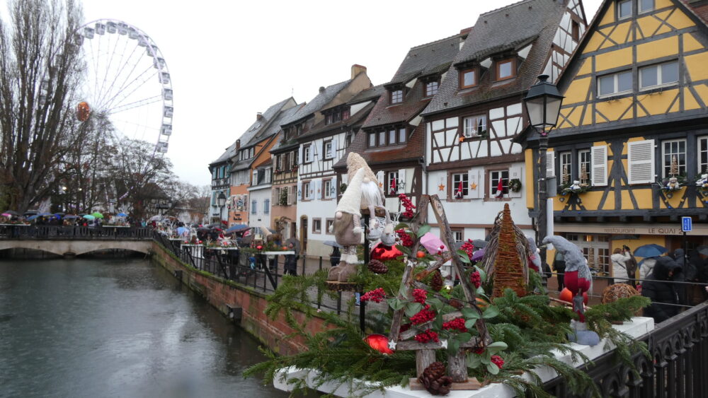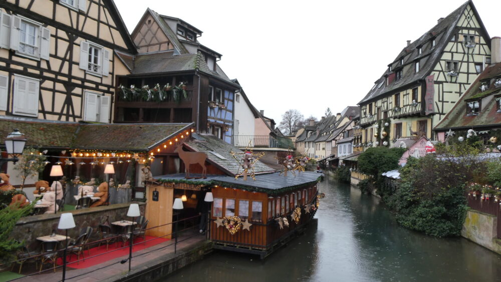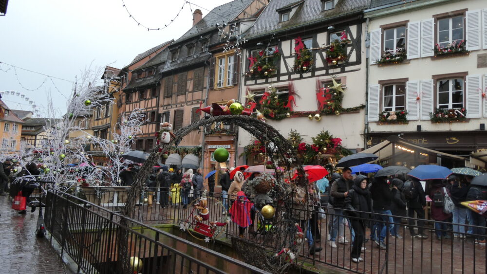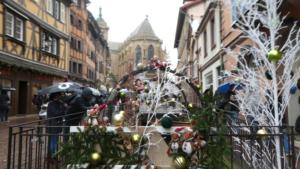 今年はルクセンブルクの2か所を含めて、5か国8か所のクリスマス市に行ってきました。先週末は、アルザス地方にある世界で最も美しいと言われているコルマールのクリスマス市を見学してきました。今回はスイスのクリスマス市も見学するため泊りがけで行きましたが、コルマールまでは列車なら最短2時間半ほど、車で3時間ほどで行けるので十分日帰り旅行が可能です。初めてクリスマスに行ったのは、30年近く前で、ルクセンブルクからの日帰り観光バスで、コルマールとストラスブールのクリスマス市を見学してきました。かっては、それほど混雑していなかったコルマールのクリスマス市ですが、バーゼルからの電車は16編成と長くつながっていたのに満席で通路も人がぎっしり立つほどでした。クリスマス市もかっての印象とは異なり、メイン会場は大混雑で、会場数も増えて、沿道での飾りもあり、かなり規模が大きくなりました。しかも日中は一時激しく雨が降る悪天候での混雑ぶりには驚きました。でも気温は15度と冬としては暖かく、冬用コートでは暑いほどでした。今回は一日コルマールにいたので、市内の観光名所や、屋内会場でのクリスマス市も見学できました。特に屋内市場では、レストランが数か所あり、多くの人が食事を楽しんでしました。また運河を走る遊覧船といっても屋根のないボートでしたが、雨がっぱを来た多くの観光客で賑わっていました。コルマールでは、クリスマス市だけでなく、商店やレストランのクリスマス飾りも凝っていて、運河沿いにもクリスマス飾りが置かれていて楽しました。