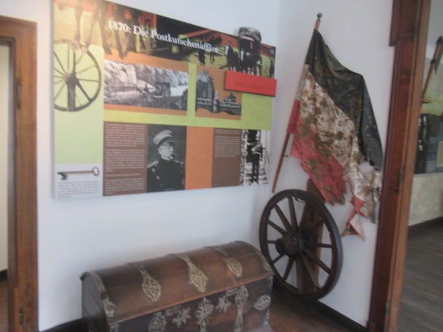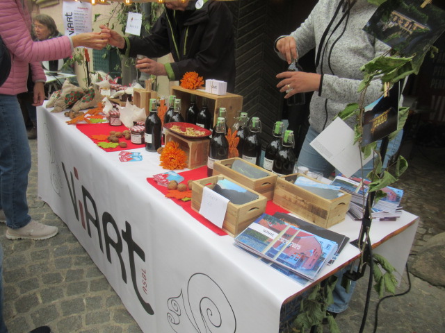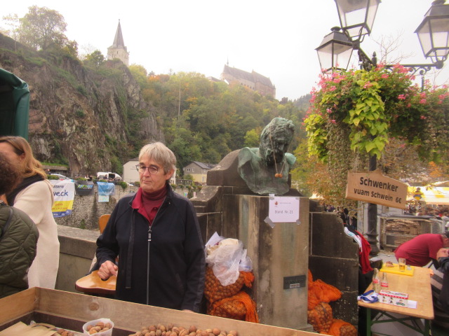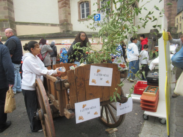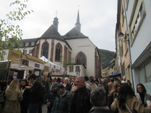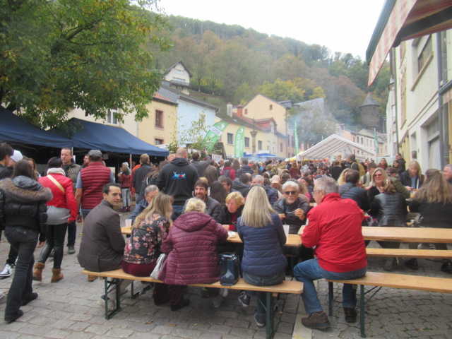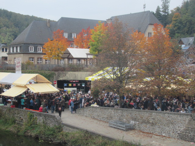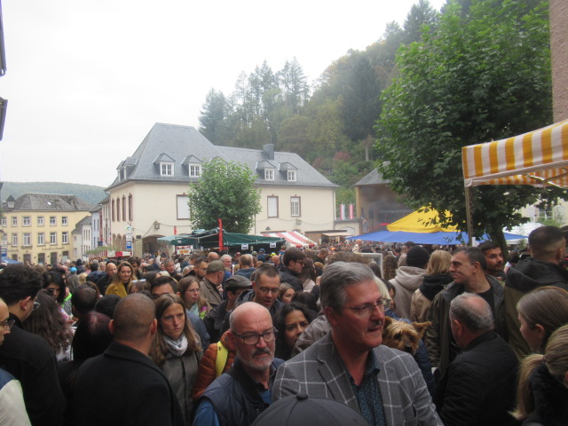 10月12日の日曜日は朝からよく晴れていたので、お昼過ぎから、Viandenで開催されている木の実市(Nut market)を久しぶりに見学してきました。工事でMerschまではバスによる代行運転で、MerschでEtterbruck行きの列車に乗りました。北へ向かう高速は久しぶりで、改めて長いトンネルが続くのが印象的でした。Etterbruckで181番のバスに乗り換えてViandenに向かいましたが、バスはすぐに満席になり、多くの人が乗れませんでした。また満員のため、途中の停留所で人が待っていても通過してしまいました。帰りは直通のバスに乗りましたが、なんとNut market行きの直通バスがEtterbruck駅前から出ていました。Nut marketは、昔に比べて、かなり規模が小さくなり、出店スタンドが大幅に減り、出店スタンドがあるところ以外は空いていました。ただ両側に出店スタンドがある地点は大混雑で歩くのが大変でした。規模が小さくなったため、時間が余って、初めて市の終わりにあった博物館に入ってみました。Viandenの歴史や民俗展示があり、思ったよりも館内が大きく、興味深かったです。